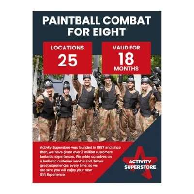 BRILLIANT GIFT FOR PAINTBALL LOVERS: This is the ultimate game of elimination and exhilaration, easily one of the most exciting games you’ll ever be part of. 25 LOCATIONS: As part of the package, you and seven friends will have entrance to one of the UK’s top paintball venues where you will enjoy multiple game scenarios. 18 MONTH VALIDITY: This experience gift voucher is valid for 18 months from the date of purchase with further extensions available. Validity Incudes free and unlimited exchanges to any of our 1,000+ experience days. 3 MILLION CUSTOMERS: Activity Superstore was founded in 1997 and since then we have given fantastic experiences to over 3 million customers! We pride ourselves on providing an outstanding customer experience. GIFTS FOR ALL OCCASSIONS: Our award-winning experience days make the perfect gift for anniversary gifts, retirement gifts, couples gifts, wedding gifts, gifts for her, gifts for him, birthday gifts, Mothers Day Gifts, Fathers Day Gifts., Manufacturer: Activity Superstore