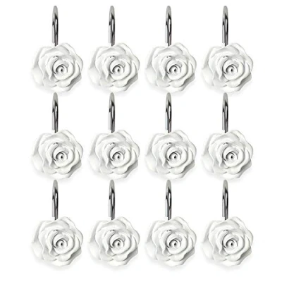 Actpe 12pcs Shower Curtain Hooks, Home Decorative Rustproof Hooks Resin Rose Flower Rings for Bathroom Rods Curtains (White)