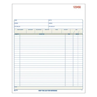 Premium grade paper Consecutive page numbers printed in red Sheet contains areas for customer information, order number, terms, date, shipping information and salesperson Columns provided to enter quantity, description, price and amount 50 sets