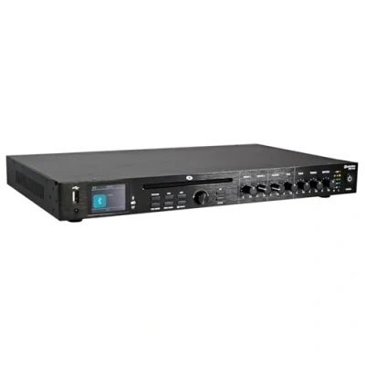 All-in-One Audio Solution | Combines a CD player, USB audio player, DAB+/FM tuner, and Bluetooth receiver in one compact device, offering multiple playback options for any professional audio setup Powerful and Efficient Amplification | Delivers an impressive 2 x 150W RMS output at 4 ohms via a robust Class-D amplifier, ensuring reliable, high-quality sound performance Flexible Connectivity for Any Setup | Features 2 mic/line combo XLR/jack inputs with switchable phantom power, a dedicated Aux input, and adjustable override for announcements, making it versatile for both fixed and portable applications User-Friendly Controls | Master volume, bass & treble EQ adjustments, and independent level controls for inputs provide precision control over your audio output with ease Compact and Professional Design | Slim 1U rack-mountable chassis with durable construction, perfect for installations in retail, events, PA systems, or fitness studios