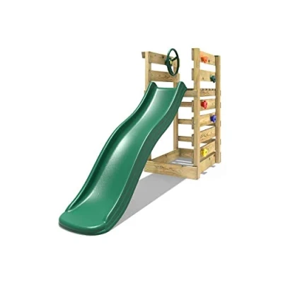 Looking to add even more excitement to your swing set? The Adventure Pack version of the add-on wooden platform and 6ft slide transforms the side of the slide deck into a climbing wall, perfect for the more adventurous members of the family. Plus, a fun play steering wheel is included for free to spark imaginative play! This easy-to-assemble deck with slide is a great way to breathe new life into an existing swing set and a fantastic addition to your Rebo wooden garden swing set. Designed specifically to fit all full-sized Rebo wooden garden swing sets, it brings a new level of fun to your outdoor space. Made from pressure-treated timber, these sturdy decks fasten securely to the side of Rebo wooden swing sets. With a 90cm platform height, the set comes with a 6ft injection-moulded slide available in a range of bright colours. As part of the Adventure Pack, it also includes a climbing wall and a play steering wheel, turning your swing set into an all-in-one playground in your