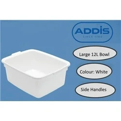 The Addis 5 Star Washing Up Bowl (White) is a spacious 12-litre, high-gloss plastic bowl ideal for butler and farmhouse sinks, featuring comfortable grip handles and a durable, easy-clean surface for convenient everyday kitchen use.