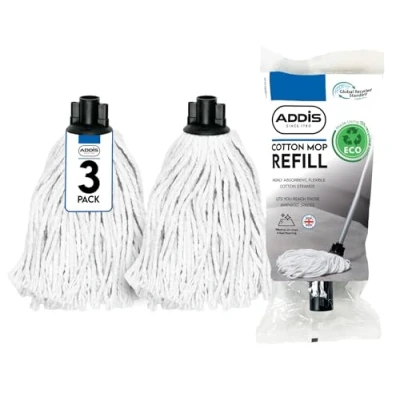 Value Pack of 3 Addis Cotton Mop Replacement Refill Heads… Ideal for Home, Office and Commercial Use Versatile and highly absorbent thick cotton strands to leave floors clean and dry Cotton mop head can be washed by hand up to 40 degrees to prolong the life of your mop head For use with the Addis cotton mop handle with screw fixing Addis 'Made for Life' part of the home since 1780