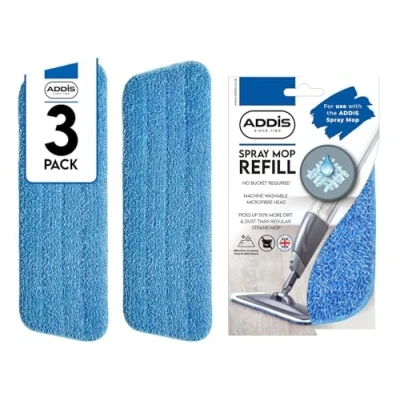 Pack of 3 replacement Addis Spray Flat mop heads Removable & washable microfiber cleaning pad 100% Microfiber - no chemicals needed Machine washable at 40 degrees Addis Since 1780 - 'made for life' Ideal for home or business use
