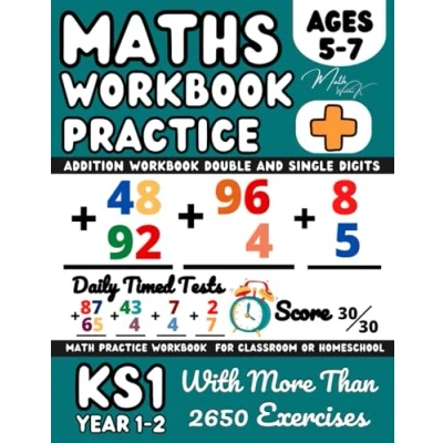 Addition KS1 Maths Year 1 2, Workbook for Kids Ages 5 7, Single and Double Digits, Timed Tests, Kindergarten Grade