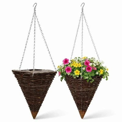 2 PACK ππππππ πππππππ ππππππS - Our garden hanging baskets outdoor come with a cone-shaped design. This hanging plant basket adds seasonal pop-up colour and can be hung in your front garden to welcome guests to your backyard. Elevate your indoor or outdoor dΓ©cor with the elegant conical shape of this 12" Cone Hanging Basket. DURABLE CONSTRUCTION - Crafted from water-resistant material, ensuring long-lasting use even in varying weather conditions. Basket comes with a liner for easy planting and maintenance, along with a rust-resistant metal hanging chain for convenient installation. VERSATILE USE - Perfect for displaying your favourite plants and flowers both indoors and outdoors, adding charm to any space. Can be planted all kinds of plants in this plant basket, including herbs and fruit as well as flowers, to create interesting and colourful displays throughout the year. EASY INSTALLATION - Simply hang it up using the included metal chain to instantly enhance your garden, patio, or living area with natural beauty. You can hang it anywhere in your garden at your ease and these chains are strong to hold the whole basket. πππππππππ β Our Pack of 2 cone hanging baskets measures approx. 12" each basket and 20in (50cm) hanging chain. This is the perfect size to make a garden basket suitable for garden, indoor, balcony and outdoor.