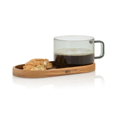 AdHoc Impact Coffee Cup with Acacia Wood Coaster, 300ml, Mug for Tea, Latte, Cappuccino Handle, Heat Resistant Borosilicate Glass, Wide Coaster Space Buiscuits