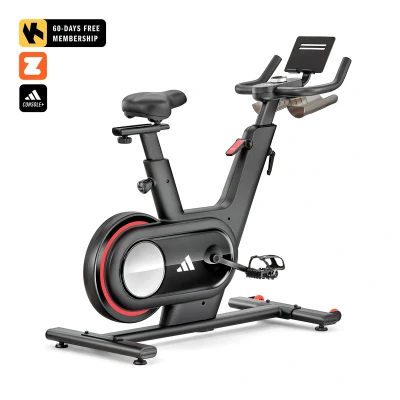 Open a world of fitness opportunities with the adidas C-1 sprint bike indoor cycle. Enjoy ultra-smooth, quiet action, a natural riding feel and road-realistic intensity thanks to the fixed 8kg (18lbs) Performance Flywheel and 32 digital resistance levels. With Bluetooth and an adjustable tablet holder, the bike offers smart connectivity for truly immersive interactive workouts. Set out on a personalised fitness journey and get access to virtual routes, video game style workouts, live coaching and detailed performance tracking with the compatible Zwift, Kinomap (60-day Free trial included) and adidas Console+ apps. Make swift adjustments with the machine's intuitive rotating dial interface and discover motivating challenges choosing from 12 onboard workouts. Ride longer and maximise results thanks to the bike's comfort features including dual-adjustable padded saddle, multi-grip handlebars, built-in water bottle holders and self-levelling pedals with adjustable straps ensuring locked-in performance.