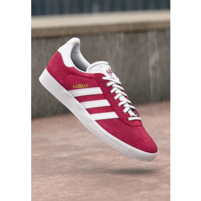 Bringing back an archive edition of the celebrated Gazelle, the sneakers show off the same textures and materials as the 1991 version. Made in suede, they feature contrast details that echo the early '90s style. Sale | Upper material: leather/synthetics/Lining: synthetics/Sole: synthetics/Insole: textile | Sale order at Zalando UK! Size: 10.5. Color: Collegiate burgundy/footwear white/gold/coloured metallic. Pattern: marl.