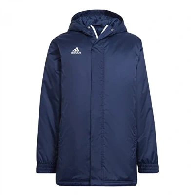 For your team. For your planet. Created with grassroots football in mind, the Entrada 22 range gives you everything you need to make your game feel and look more beautiful. This juniors' adidas jacket is insulated to keep you warm when you're standing on the sidelines. The hood and storm flap bolster your defences against the elements.Made in part with recycled content generated from production waste, e.g. cutting scraps and post-consumer household waste, to avoid the larger environmental impact of producing virgin content. - Regular fit - Full zip with hood - Shell: 100% nylon dobby - Fill: 90% recycled polyester, 10% polyester insulation - Front zip pockets - Storm flap with snap closures - Elastic cuffs - Hanger loop Shipped by adidas