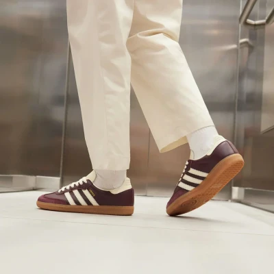 The adidas Samba OG - Women's - Maroon Gold Metallic takes the classic Samba silhouette design and applies a rich colorway of maroon with Metallic Gold details. The upper construction boasts smooth leather in maroon, while the toecap is made of soft suede in tonal maroon. The difference in textures creates subtle contrast and a luxury feel. The signature serrated 3-Stripes logo on the side panels is made of white leather. ‘SAMBA’ in Metallic Gold lettering runs along the 3-Stripes logo on the lateral side panel and complements the gold adidas logo printed on the tongue tag. Both the tongue and heel collar come in Cream White, which adds to the sneaker’s vintage appeal.