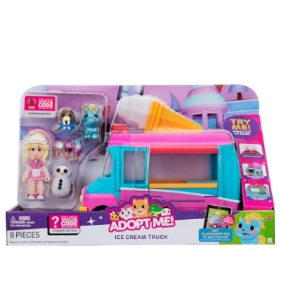 TRANSFORMING VEHICLE: Travel around Adoption Island with a mobile Ice Cream Truck that has a fold-out counter, an opening roof, a cooler, and ice cream holders for three cones LIGHTS & SOUNDS: Press the button on the giant ice cream cone to make it glow through rainbow colours and play music THREE PETS & 1 FIGURE: Add the Articulated Figure, Visitor June, and three pets - the Snowman, the Summer Walrus, and the Diamond Unicorn - to your Adopt Me! collection VIRTUAL ITEM CODE: Redeem your Adopt Me! UGC Virtual Item to accessorise your avatar across all experiences MORE TO COLLECT: Expand your Adopt Me! collection with Mystery Pets, Plush, Playsets, Friend Packs, and more, Manufacturer: Jazwares
