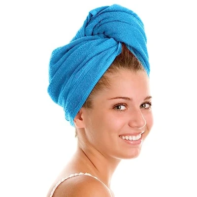 Adore Home 2 x Hair Turban Towel 100% Cotton Absorbent Soft Wrap With Loop & Button, Aqua