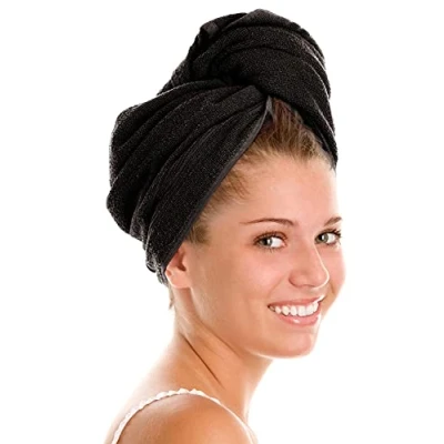 Adore Home 2 x Hair Turban Towel 100% Cotton Absorbent Soft Wrap With Loop & Button, Black