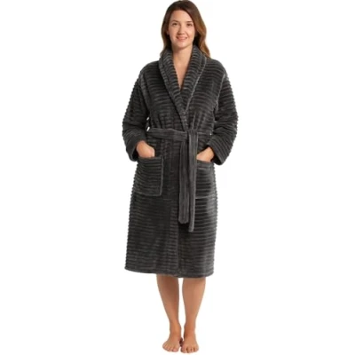 Adore Home Ladies Extra Warm Dressing Gown Luxurious Ribbed Fleece Bathrobe with Cosy Sherpa Lining, Charcoal, S M