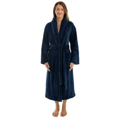 Adore Home Ladies Extra Warm Dressing Gown Luxurious Ribbed Fleece Bathrobe with Cosy Sherpa Lining, Navy, S M
