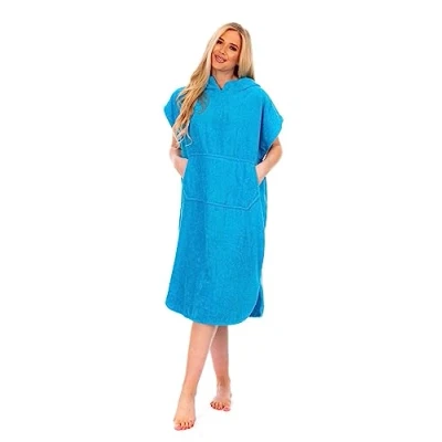 Stay cosy and comfortable: Made with premium 100% cotton fabric, this women's hooded changing robe offers exceptional softness and warmth, keeping you snug before and after water activities Easy changing on the beach: This changing robe provides the ultimate privacy for changing out of wet swimwear, wetsuits, or bathing suits, making it ideal for beach outings and water sports. Generous size: Designed to provide ample coverage, this hooded changing robe is perfect for quickly changing in public areas while ensuring modesty Sizes - S/M - Armpit to Armpit across front - 65cm Length 105cm L/XL - Armpit to Armpit across front - 75cm Length 115cm. Model is 5ft 10' with 34" chest and wearing a S/M changing robe Convenient pocket design: Features a spacious front pocket, perfect for storing your essentials such as keys, sunscreen, or a phone, allowing for easy access while on the go.
