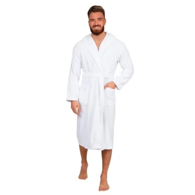 Adore Home Mens 100% Cotton Hooded Bathrobe Terry Towelling Shawl Collar Bath Robe Dressing Gown White