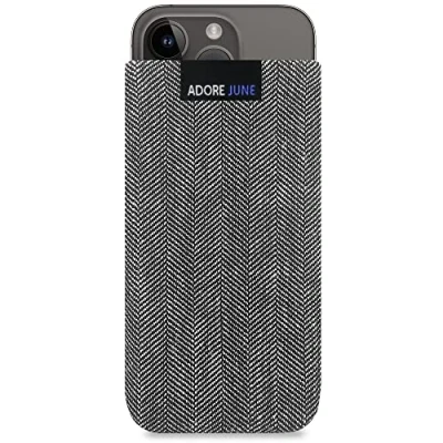 This fabric case was specially developed for the iPhone 15 / iPhone 15 Pro / iPhone 14 / iPhone 14 Pro (6.1") (without bumper or cover) The design is timeless and reduced to the essentials; Design is Adore June's passion, quality the requirement; Designed in Hamburg Protects the iPhone 15 14 / iPhone 15 14 Pro from dust, dirt and scratches; This textile case lets you experience the pleasure of the smartphone in its entirety This pouch is handmade in Europe; Adore June attaches great importance to good materials and high workmanship quality The Business sleeve is composed of a herringbone fabric on the front and black canvas on the back.; The lining is made of soft polar fleece that cleans the display.