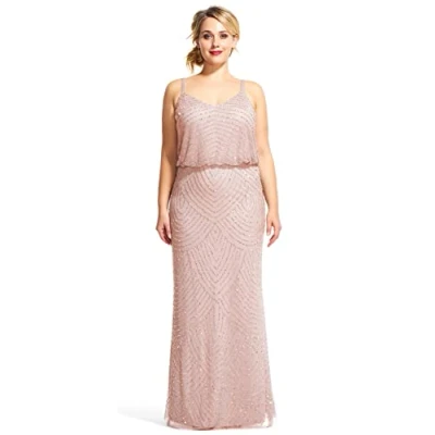 A scalloped pattern of sparkling beads cascade down this beautiful gown, featuring a flattering blouson silhouette Exude maximum glamour when you opt for this beaded evening dress for your upcoming wedding, prom or gala A stunning option for everything from a beach wedding, to the ballroom, this floor-length sequin gown features spaghetti straps, a flattering v-neckline, and a blouson bodice A scalloped, art deco pattern filled with sparkling sequins and beading adorns this evening gown, which also features a back-zipper closure Add a pair of sparkling earrings to this beautiful beaded dress to seal the deal on a stellar special occasion look This Adrianna Papell design has been made from the finest and most luxurious fabrics All bead work, embroidery and ornamentation has been done completely by hand Slight irregularities or variations should not be regarded as defective or damaged, rather a testament to the garment s unique beauty