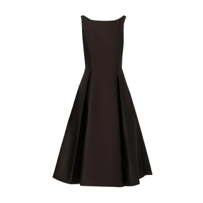 Tea-length fit-and-flare dress with high boat neckline and deep V-back Pleated skirt Pockets Hidden back zipper Sleeveless boat-neck fit-and-flare cocktail dress in black