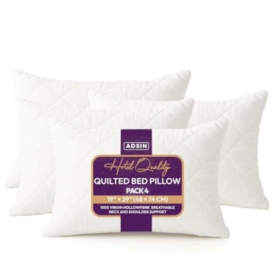 Plush Comfort & Support – Our soft pillows are filled with high-quality, hypoallergenic polyester fibers for a cloud-like feel while providing essential support. The quilted cover enhances luxury and breathability. Premium 4-Pack Set – Adsin standard-size pillows (48cm x 74cm / 19” x 29”) designed for superior comfort. Perfect for all sleeping positions and ideal for upgrading your bedding. Long-Lasting Durability – Crafted with 100% Virgin White Hollowfibre, these hotel quality pillows offer the perfect balance of comfy pillows and firm support. Precision stitching ensures resilience and bounce-back performance. No Lumps, Just Comfort – The advanced quilting pattern evenly distributes the filling, preventing clumping and ensuring a consistently smooth sleeping surface. These bed pillows 4 pack retain their shape night after night. Perfect for All Sleepers – Designed to conform to your body’s natural curves, Our best pillow provide excellent support for your head, stomach, neck, and shoulders, etc ensuring proper alignment in any sleeping position.