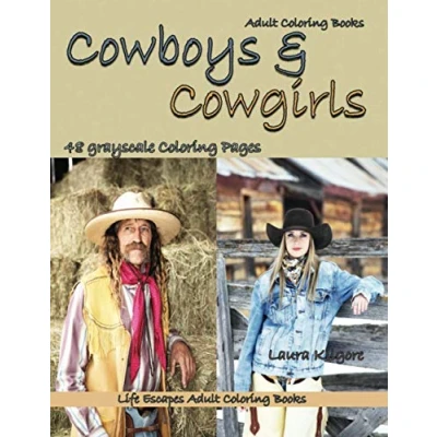 Adult coloring Books Cowboys & Cowgirls: Life Escapes grayscale 48 pages cowboys, cowgirls, cowboy hats, plaid shirts, horses, ranches, children and more