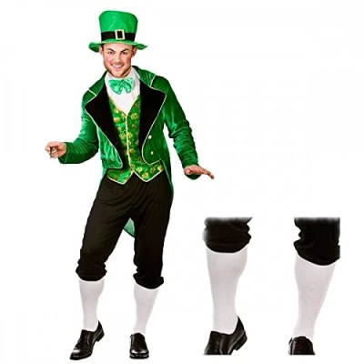 Adult Sizes: Small (Chest 37"); Medium (Chest 41"); Large (Chest 44"); X-Large (Chest 48") The Deluxe Leprechaun costume by Wicked Costumes Includes a jacket with attached waistcoat, shirt front with bow tie, 3/4 length trousers and soft fabric hat White knee socks ALSO included Mini cauldron not included, Manufacturer: A2ZFD