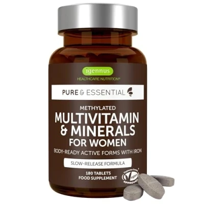 Advanced Methylated Multivitamin Tablets for Women, High Potency & Clean Label, Sustained Release, Active B12 Vitamins Plus Gentle Iron, Easy to Swallow, Vegan, 180 Tablets, 90 Servings, by Igennus