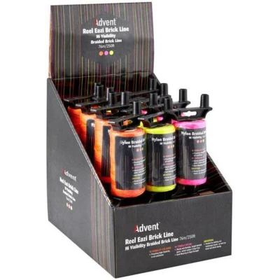 General description The Advent Reel Eazi Brick Line provides high visibility in all conditions and is made from high tensile nylon that has been tough twisted, making it sturdy, durable, and sag-free. The professional handle allows for easy spool changes and features a top notch to secure the loose end of the line. It spins freely to release the line without twisting or knotting, and can be rewound manually or automatically using a power screwdriver inserted into the slot in the bottom of the handle. This product is perfect for landscaping, laying paving, fencing, and any DIY job that requires a plumb line. Supplied in a display box of 12 in mixed colors: Pink, Yellow, and Orange. Technical specifications Line Length: 76m/250ft Manufacturer Part Number (MPN): ADVRELBLD12 EAN: 5060027020998 Other information