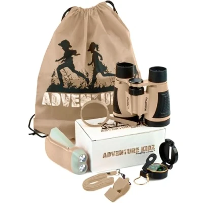 Adventure Kidz Outdoor Exploration Kit, Children’s Binoculars, Flashlight, Compass, Fox Whistle, Magnifying Glass, Backpack. Great Gift Set for Educational, Pretend Play, Ages 3+ Boys Girls (Brown)