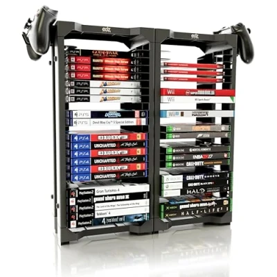 Spacious PS5 game holder : Holds up to 46 discs, compatible with Xbox 360, Xbox One, Xbox Series X, PS2, PS3, PSP, PS4, PS5, Wii and Switch video game storage. As well as Blu Ray and DVD discs. Includes hooks for headsets or controllers. Headset and controller hooks : Conveniently store your PS4, PS5, Switch or Xbox gaming accessories such as controllers or headphones with headset hangers that attach to the game rack. Game organizers and storage : Keep your games in one place with this video game organizer. The game holder stand can be stacked as a horizontal game holder or vertical. Making the perfect game shelf for all of your media. Versatile Blu ray disc rack : Perfect for video games and more - Utilize this high-capacity game tower for storing your Blu-ray or DVD collection alongside games. Space-saver, functionality at its best. Sturdy game tower storage rack solution : This PS5 game tower is made of high-quality ABS materials and designed to last, making it the perfect video game case shelf for your Xbox or PlayStation games.