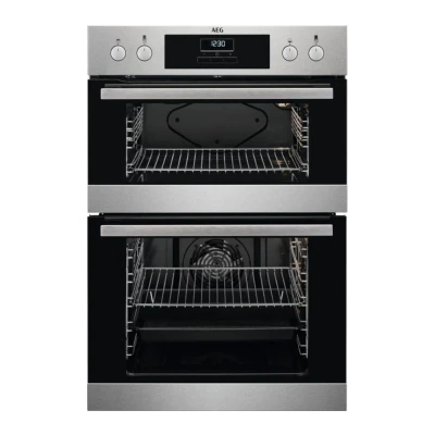 DOUBLE OVEN - DOUBLE DISHES FOR DOUBLE DELICIOUS: Effortlessly cook two meals at once. With the Double Oven you have the choice of fan cooking, conventional cooking and grilling. Giving you two separate areas where you can chose to bake or roast two dishes at the same time. GOOD TO KNOW - Cook two delicious meals at once with this AEG electric double oven. With a 66-litre capacity, you’ll have all the space you need to make a feast, whether it’s a Sunday roast for family and friends or a three-course dinner. And because the main oven has SurroundCook technology, hot air is sent to every shelf, so your food is cooked evenly on all sides – no more soggy Yorkshire puds. You can leave the scouring pad where it is too, since both ovens have an enamel interior which stops grease from sticking. That’s one less task to worry about. COOKED EVENLY EVERYWHERE: With this oven, using energy efficiently also means cooking efficiently. It has a new convection system called SurroundCook, which ensures hot air circulates evenly throughout the oven cavity. The result is that the oven heats up faster and cooking temperatures can be reduced by up to 20%, saving you both time and energy. A QUICKER WAY TO TOAST AND CRISP: This highly efficient grill takes less time than traditional ovens, and will toast, crisp or brown your dishes to precision. AN ACCESSIBLE OVEN: This oven is designed with accessibility in mind; the trays can be inserted quickly and smoothly into the racks. AN AT-A-GLANCE OVERVIEW OF THE STATUS OF YOUR DISH: The timer display provides an at-a-glance overview of the status of your dish. Its clear screen enables you to set an alarm, check directly on the time remaining before your dish is ready and to adjust the timer with accuracy and precision.