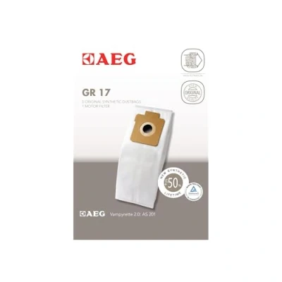PACK OF 5 BAGS + 1 MOTOR FILTER: Contains five AEG GR17 synthetic vacuum cleaner bags (size 17) and one motor filter for regular replacement and maintained vacuum performance. 50% LONGER SUCTION POWER: High-performance synthetic material provides up to 50% longer suction power and service life compared to conventional paper bags. FINER FILTRATION PERFORMANCE: Multi-layer synthetic construction offers finer filtration—up to 50%—for improved dust capture and durable everyday cleaning. PRACTICAL AND EASY HANDLING: Designed for simple installation and clean replacement, supporting efficient use in compatible AEG handheld and stick vacuum models. BEST FIT FOR SPECIFIC MODELS: Suitable for AEG Vampyrette models AS201, AS210, AS230 and AVBG3, ensuring correct fitting and optimal dust collection.