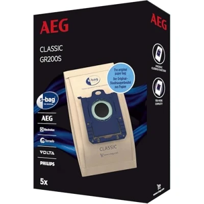 PACK OF 5 PAPER DUST BAGS: Contains five original AEG GR200S S-Bag Classic vacuum cleaner bags made from paper, suitable for regular replacement in compatible vacuum models. HYGIENE CLOSURE SYSTEM: Patented hygienic closure keeps dust securely inside the bag when removed, preventing dust release into the environment during bag changes. POWERFLOW SIDE FOLD DESIGN: Special side-fold construction increases internal volume and helps maintain strong suction performance and optimal filter effect throughout use. WIDE COMPATIBILITY: Standard S-Bag size fits a broad range of Electrolux, AEG, Tornado, Volta and Philips vacuum cleaners, including models across UltraSilencer, SilentPerformer, PowerForce, AirMax and VX series. PATENTED PLASTIC ATTACHMENT: Designed with a patented plastic connection for secure fitting and correct placement on over 70 different series of compatible vacuum cleaners
