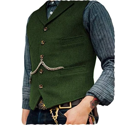 AeoTeokey Classic Mens Wool Tweed Suit Vest Casual Sleeveless Jacket Herringbone Waistcoat for Tuxedos(3XL,Green)