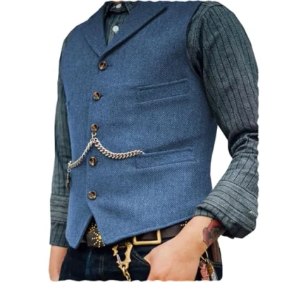 AeoTeokey Classic Mens Wool Tweed Suit Vest Casual Sleeveless Jacket Herringbone Waistcoat for Tuxedos(L,Blue)