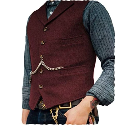 AeoTeokey Classic Mens Wool Tweed Suit Vest Casual Sleeveless Jacket Herringbone Waistcoat for Tuxedos(M,Burgundy)