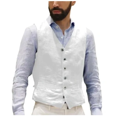 AeoTeokey Men's Linen Waistcoat Summer Suit Vest Vintage Retro Business Party Regular Fit(White,M)