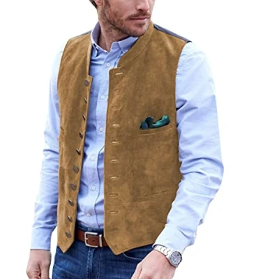 AeoTeokey Men's Suit Vest Suede Leather Vintage Casual Western Cowboy Waistcoat(XXL, Gold)