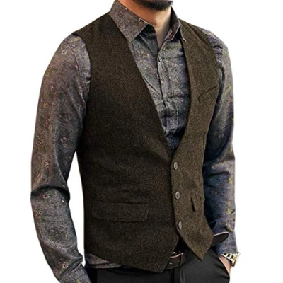 AeoTeokey Men's Tweed Vintage Suit Vest Casual Herringbone Wool Wedding Groomsmen Waistcoat(L,Coffee)