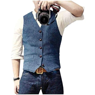 AeoTeokey Men's Vintage Suit Tweed Vest Herringbone V Neck Dress Waistcoat Wool Groomsmen(XL,Blue)
