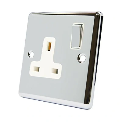 13 Amp Single 1 Gang Electrical Wall Plug Socket Polished Chrome Silver Effect Mirror Effect Classical Style - Raised Profile White Insert with Metal Rocker Switch, Manufacturer: AET