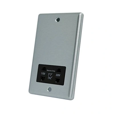 Dual Voltage Shaver Socket 115V/230V Brushed Satin Matt Chrome Stainless Steel Effect Metal Plate Classical Style - Raised Profile Black Insert 2-Gang Plate, Weight: 0.330693393 pounds, Manufacturer: AET