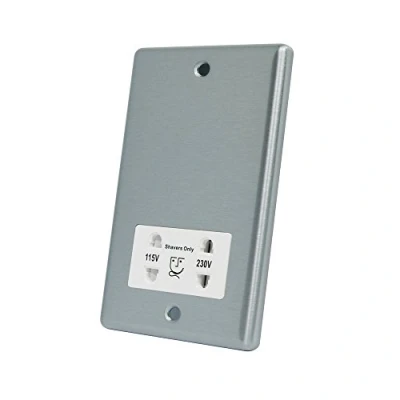 Dual Voltage Shaver Socket 115V/230V Brushed Satin Matt Chrome Stainless Steel Effect Metal Plate Classical Style - Raised Profile White Insert 2-Gang Plate, Weight: 0.330693393 Pounds, Manufacturer: AET