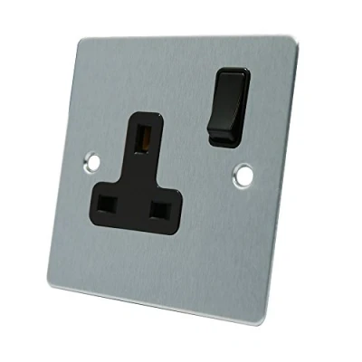 13 Amp Single 1 Gang Electrical Wall Plug Socket Brushed Satin Matt Chrome Stainless Steel Effect Metal Plate Sleek & Stylish Flat Plate. Mounting back box: min. 35 mm deep Black Insert with Plastic Rocker Switch, Manufacturer: AET