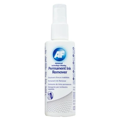AF Permanent Ink Remover effectively removes marker pen stains from non-porous surfaces Suitable for use on whiteboards, non-readable sides of CDs/DVDs and computer casings Alcohol free, 125ml Ideal for schools, offices and home. Simply spray onto affected surface area and use AF Safecloths to remove permanent ink. Repeat process if necessary.