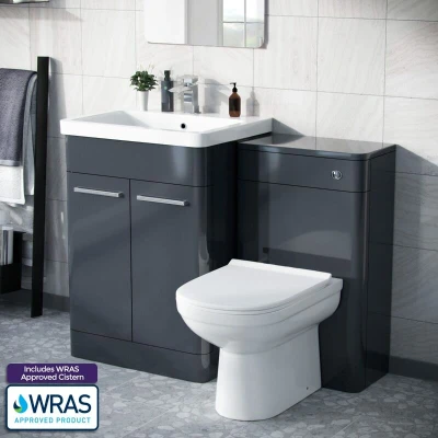 Description Strong square shapes fuse with subtle curves to make this toilet fit perfectly within this contemporary bathroom suite. The beautiful Anthracite gloss freestanding basin vanity unit comes complete with high-quality basin. Engineered with everyday use in mind, providing a storage solution for your bathroom, our Basin Vanity Unit gives you the best of both worlds, combining incredible durability and a beautiful gloss finish. Key Features Water resistant 16mm Grade A MDF Luxurious gloss finish, perfect for contemporary bathrooms Back to wall toilet pan High gloss glaze white finish Specifications Vanity Unit Specifications 2 Door Cabinet Material: Water resistant 16mm Grade A MDF Finish: Anthracite Gloss Handle Material: Polished Chrome Stainless Steel Height - 800mm Width - 580mm Projection - 355mm Basin Specifications Basin Material: Ceramic With One Tap Hole Height - 180mm Width - 500mm Projection - 385mm Material - Ceramic Finish - White WC Specifications Furniture Type