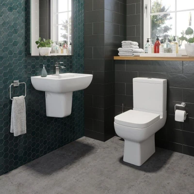 General description Update and upgrade your bathroom with this stunning package from Affine. The Amelie Cloakroom Suite with Semi Pedestal is perfect for smaller than average bathrooms or for giving your ensuite a new lease of life. This suite is known for being one of the most efficient space-saving ranges on the market, featuring a close coupled toilet that projects only 600mm away from the wall, making it ideal for tight spaces. The smooth square design adds a beautiful modern touch to your bathroom. Technical specifications Suite Type: Toilet & Basin Suite Style: Modern Toilet Type: Close Coupled Toilet Projection: 430mm Toilet Height: 400mm Toilet Width: 355mm Soft Close Seat: Yes Basin Type: Semi Pedestal Basin Height: 295mm Basin Projection: 405mm Basin Width: 550mm Basin Tap Holes: 1 Collection: Amelie Installation The basin and semi pedestal are designed to sit flush against the wall or tiles, providing a clean and minimalistic feel in your bathroom. This makes them ideal for