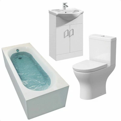 General description This stunning Bathroom Suite is designed with space-saving in mind, making it perfect for smaller bathrooms, ensuites, or cloakrooms. It includes a Ceramica Arles Space Saving Close Coupled Toilet with a soft close seat, a 1700mm Single Ended Curved Bath, and a 550mm wide Alpine White Gloss Bathroom Sink Cabinet with Basin. This suite combines modern style with functionality, ensuring you have everything you need for your daily routine while maximizing your space. Technical specifications Bath Length: 1700mm Bath Width: 700mm Toilet Projection: 605mm Toilet Height: 815mm Toilet Width: 358mm Basin Height: 836mm Basin Projection: 430mm Basin Width: 550mm Basin Tap Holes: 1 Bath Capacity: 135 litres Installation Flat pack installation with numbered pieces and clear instructions for easy assembly. Pre-drilled holes for waste and overflow in the bath for hassle-free setup. Toilet fixings included for secure installation. Usage Soft close toilet seat prevents slamming,
